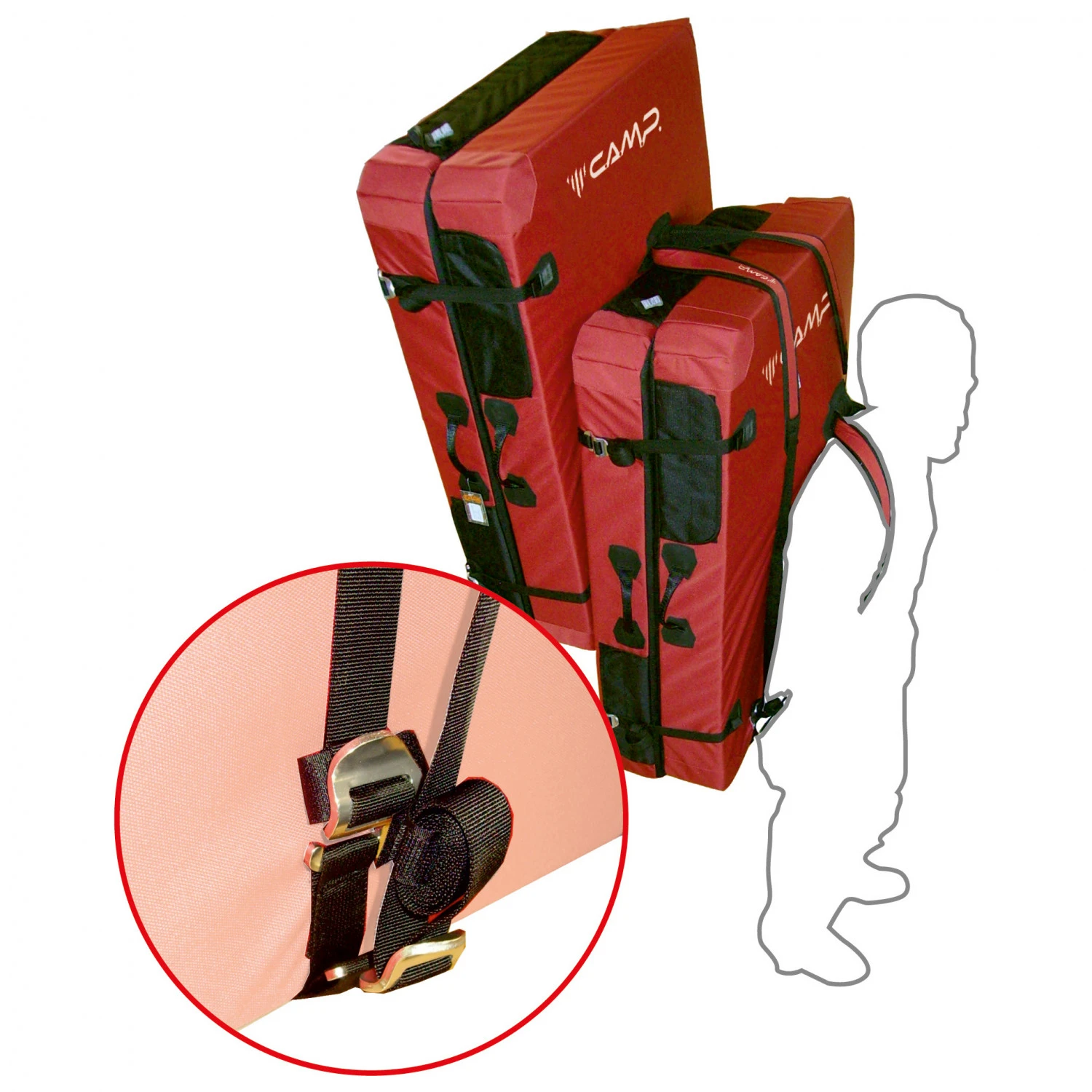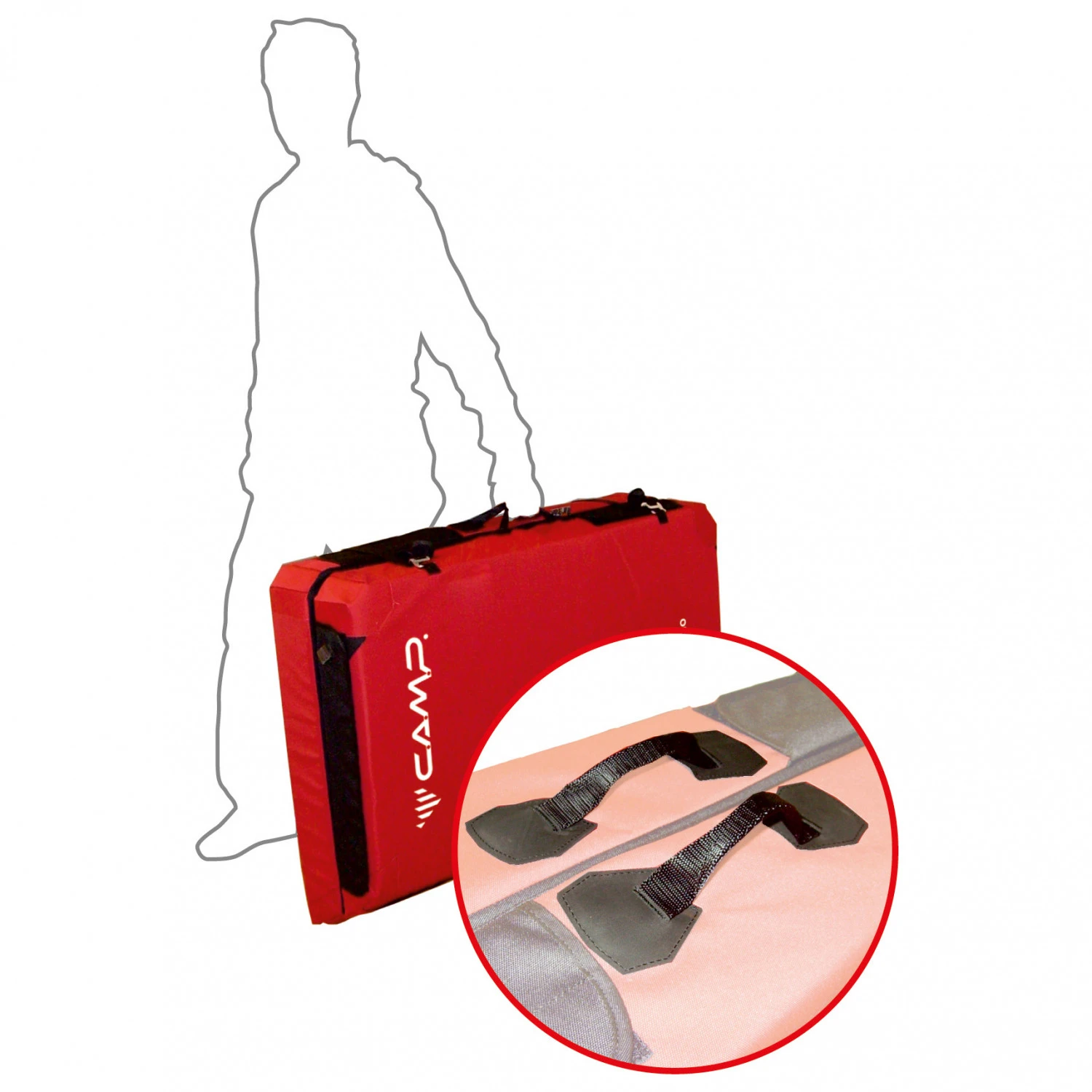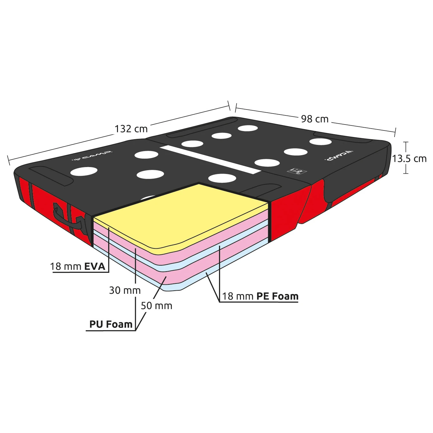 Das Domino Crashpad von C.A.M.P. besteht aus weichem, 13,5 cm dickem EVA-Schaum. Zur Verstärkung hat es an den Ecken Hypalon-Einsätze. Damit Du es gut zum Felsen und wieder zurücktransportieren kannst, ist es zusammenklappbar, mit Schnallen zu befestigen und dann mit Schultergurten zu tragen.