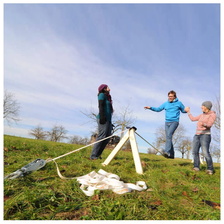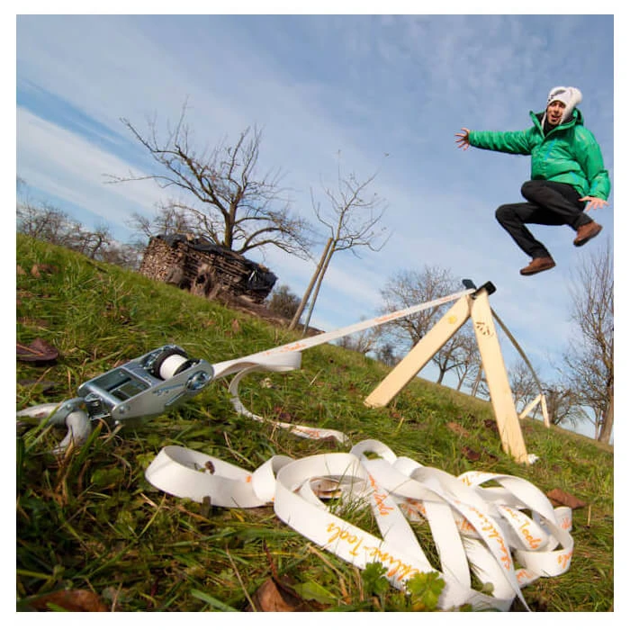 Das Set gibt’s wahlweise mit 10 oder 15 Meter langer Slackline und 70, bzw. 90 cm hohem Slack-Frame.