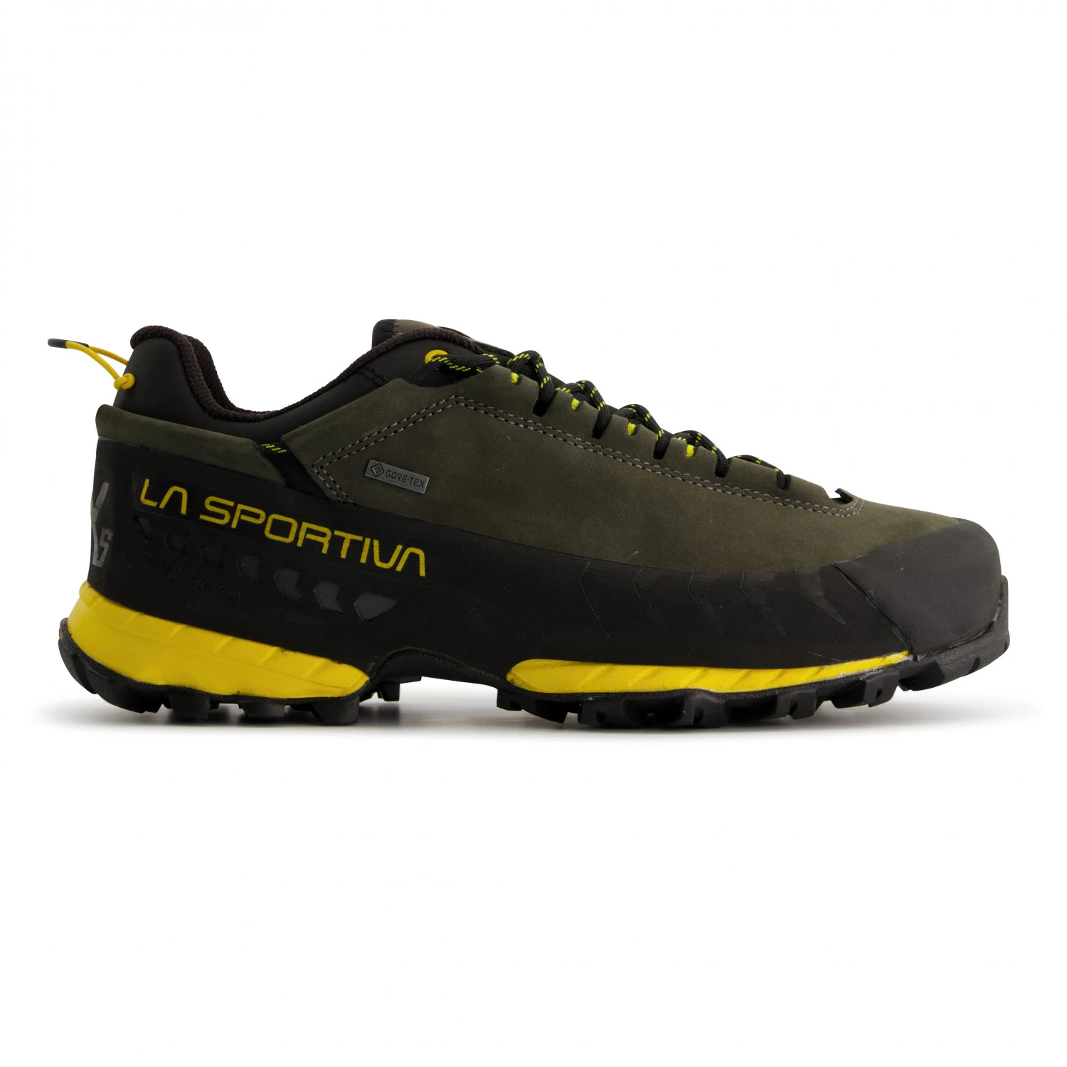 Für Wanderungen, Klettersteige und Zustiege zum Wandfuß sind die TX5 Low GTX Approachschuhe von La Sportiva uneingeschränkt zu empfehlen. Sie sind aus hochwertigem Nubukleder gefertigt und mit ihrem breiten Gummischutzrand besonders gut vor Beschädigungen und Abrieb geschützt. Maximalen Grip auf Fels, Geröll und losem Untergrund bietet die MegaGrip Sohle von Vibram. Sie wird durch eine stabilisierende Brandsohle, EVA Dämpfung und 4 mm Ortholite Approach Einlegesohlen ergänzt. Die stark haftende Sohle mit breiter Ferse und griffigen Stollen liefert sowohl bergauf, als auch bergab, sehr guten Halt in anspruchsvollem Terrain. Zuverlässigen Schutz vor Nässe erhält der Lederschuh durch seine GORE-TEX Extended Comfort Membran, die den Schuh wasserdicht und gleichzeitig angenehm atmungsaktiv macht. Stabilität und Komfort verbindet der TX5 Low GTX optimal.