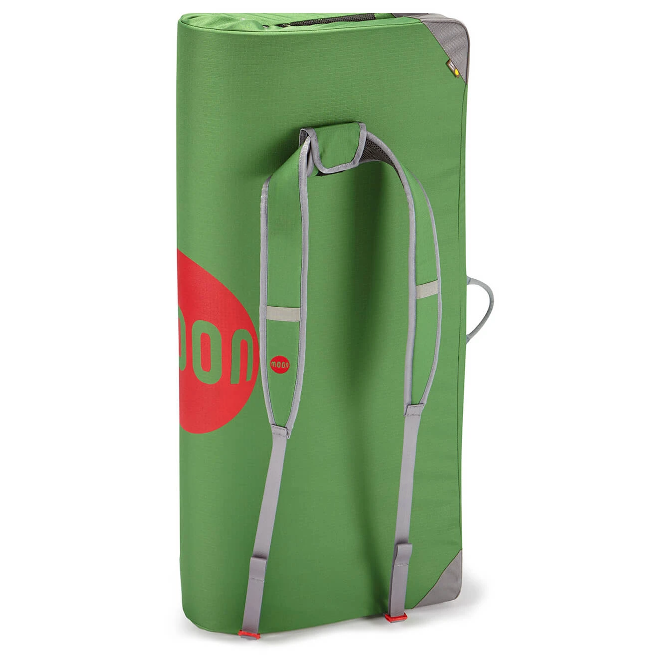 Innen findet sich eine dünne Lage geschlossenzelliger PE-Schaum sowie eine dicke Lage offenzelliger Schaum. Diese Lagen absorbieren Stöße, indem die Aufprallenergie optimal verteilt wird. Das äußerst robuste, abriebfeste Ballistic Nylon kommt als Außenmaterial zum Einsatz und schützt den Schaum vor Fremdeinwirkung. Zusammengehalten wird das Pad mit hochwertigen Aluminiumschnallen und einige Schlaufen und Griffe machen das Handling beim Transport einfach. Das Pluto von Moon Climbing ist ein durchdachtes Crashpad, das sich auch wunderbar in größeren Crashpads verstauen lässt!