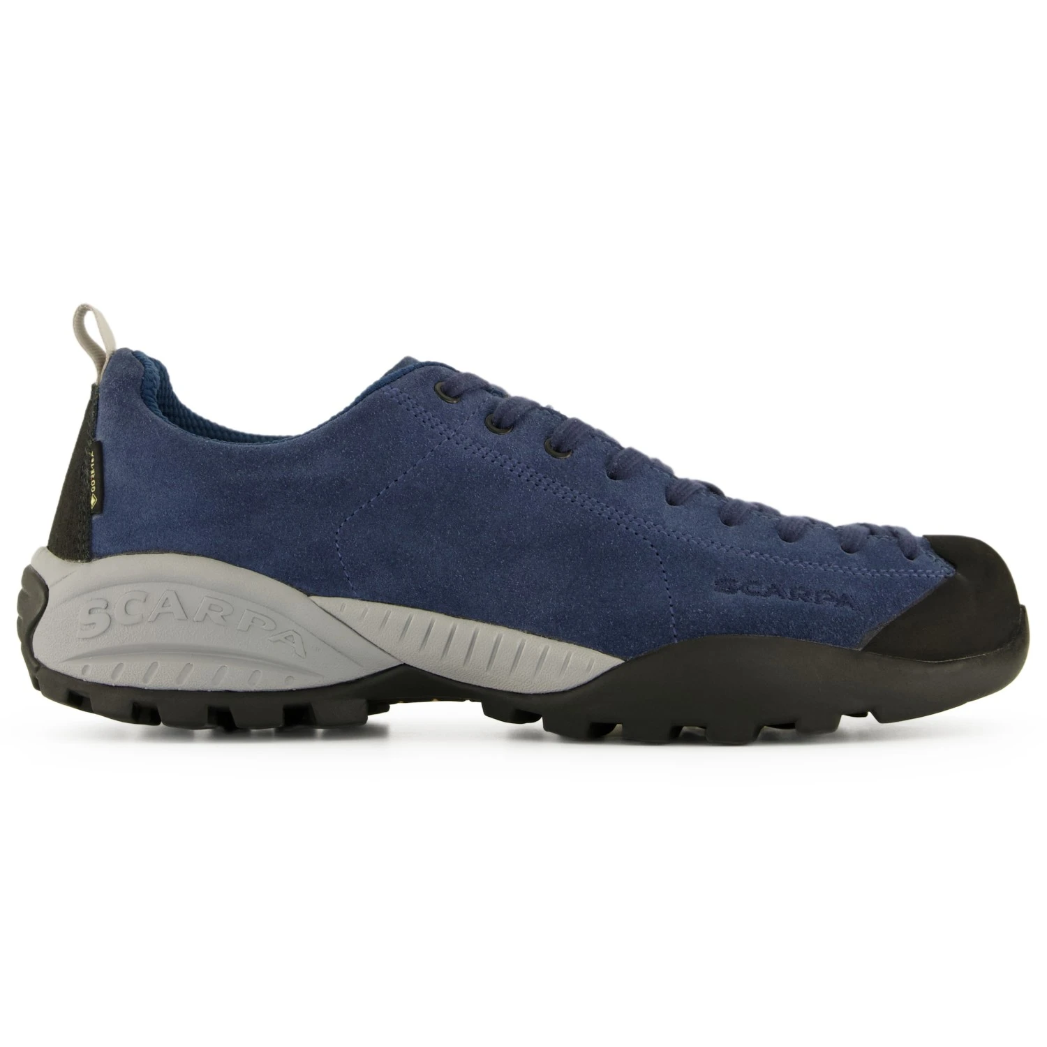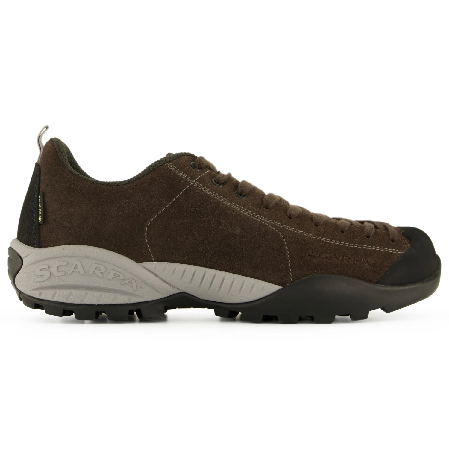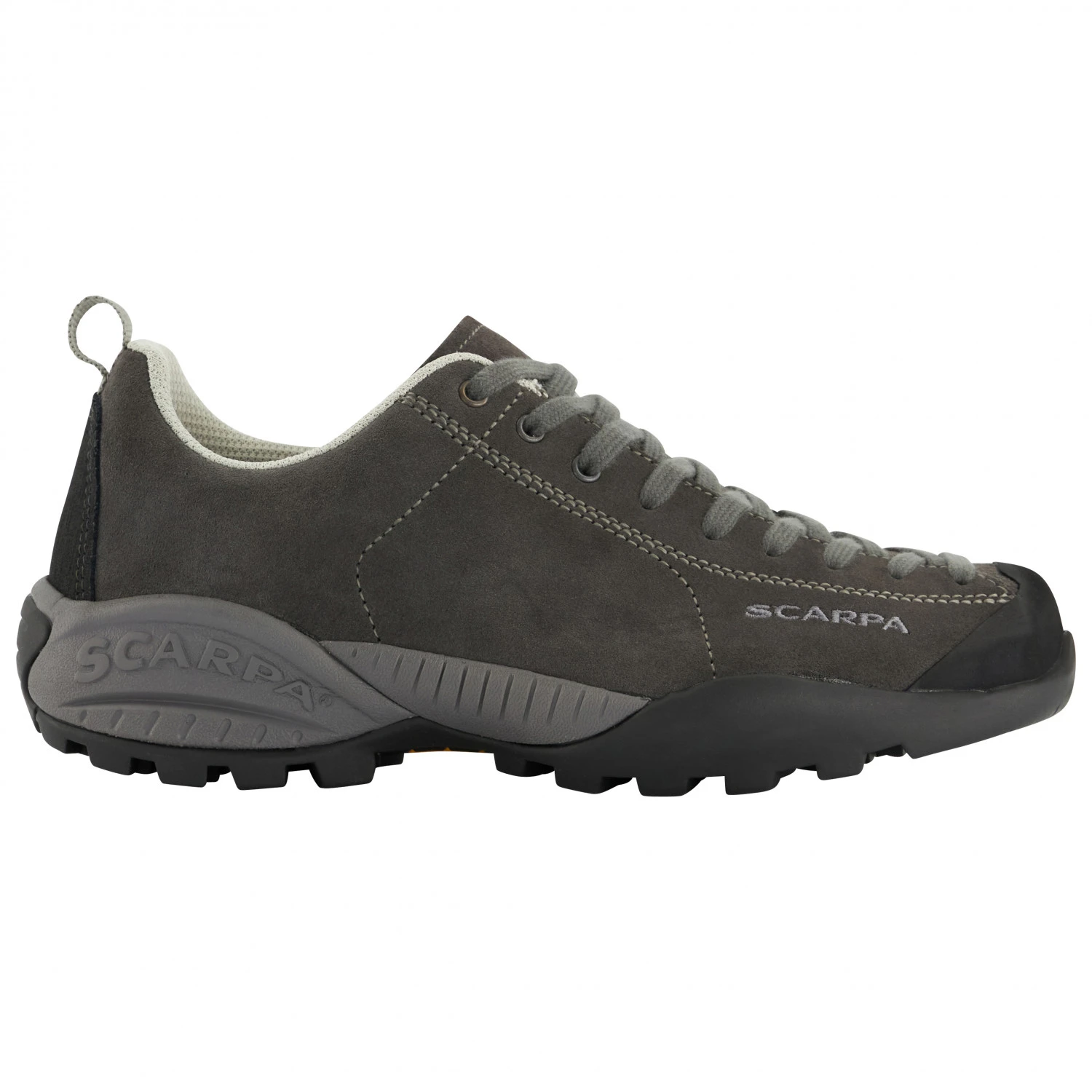 Ob durch Laubwälder oder durch den Großstadtdschungel – die Scarpa Mojito GTX machen alles mit! Sie verbinden das schöne Design aus weichem Veloursleder mit funktionalen Extras. Das verwendete GORE-TEX Material ist wind- und wasserdicht, lässt den Fuß aber trotzdem atmen. So kann Wasserdampf von innen nach außen entweichen! Eine Zehenkappe schützt vor spitzen Kanten und Ecken. Die Gummisohle kommt mit einem EVA Fußbett, das Stabilität und Tragekomfort bringt! Eine angenehme Fersendämpfung ist ebenfalls mit dabei. Durch die tief gehende Schnürung sitzt der Schuh fest und bequem am Fuß. Der Mojito GTX ist bei jedem Wetter ein guter Begleiter und meistert den Weg über Stock und Stein ohne Probleme!