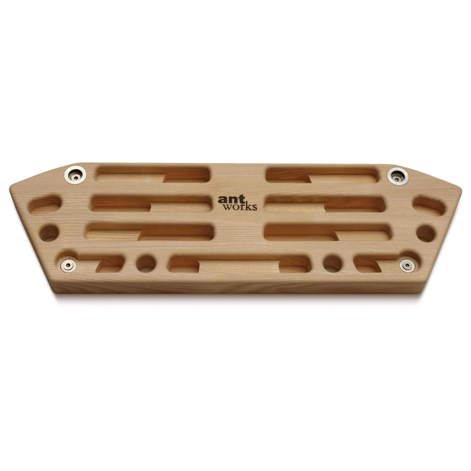Ideal für heimische Trainingseinheiten – das Strong Ant III von Antworks! Gleich auf den ersten Blick überzeugt das Trainingsboard mit einem ausgeglichenen Design, das ganz ohne fallende Linien auskommt. Die klare Griffanordnung fordert einen dabei augenblicklich zum Hangeln ein, während die unterschiedlichen Grifftiefen (16 und 37 mm) für wechselnde Herausforderungen sorgen. Die Fingerlöcher, sowie die Oberkante kommen mit einer Tiefe von 40 mm. Alle Kanten sind mit einem Radius von 6 mm abgerundet. Zu guter Letzt sei dann noch das hochwertige Material erwähnt: ganz egal wie sehr man die Finger beim Training auch quält, das geschliffene Eschenholz des Antworks Strong Ant III Trainingsboards ist ein echter Hautschmeichler!